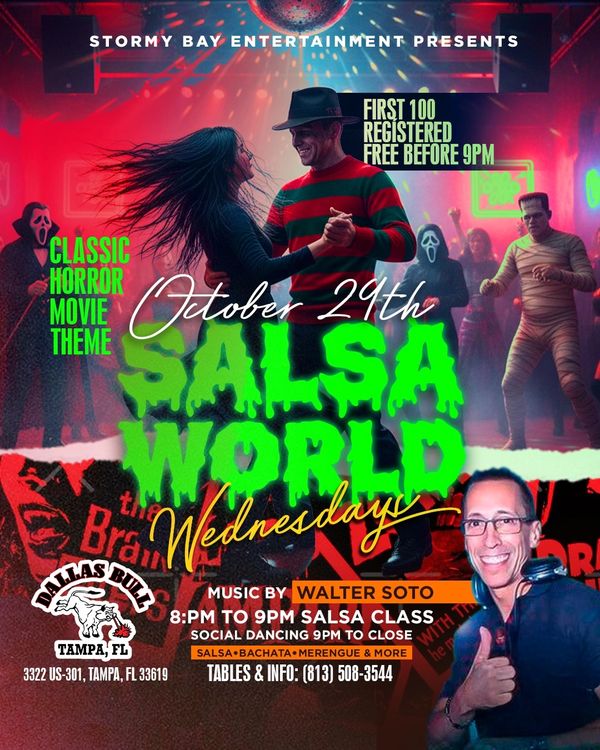 Join us for Salsa World Wednesdays at Dallas Bull, where Freddy, Frankenstein & Ghostface might just join you for a spin! 😱💀