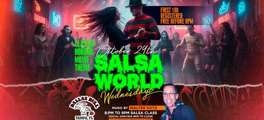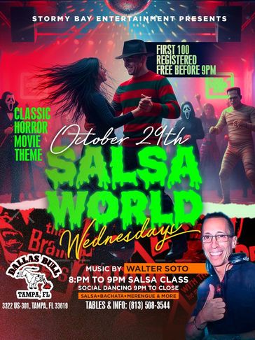 Join us for Salsa World Wednesdays at Dallas Bull, where Freddy, Frankenstein & Ghostface might just join you for a spin! 😱💀